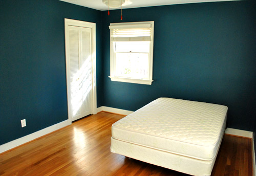 Terminamos de pintar o quarto de hóspedes. E ele é muito ousado. Sério, é como nenhum outro cômodo que já pintamos antes. E nós adoramos. Com urv maiúsculo. Esta é provavelmente a foto mais precisa (bem, acho que é tão precisa quanto seu monitor) do azul-petróleo escuro que escolhemos: