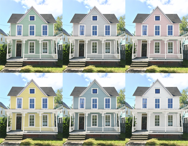 Sei que parece estranho dizer “sensação de arco-íris” e depois falar sobre pintar a nossa casa com uma cor neutra. Mas adoramos uma boa cor neutra – especialmente porque, nesse contexto, ela nos permitiria escolher móveis brilhantes para a varanda ou até mesmo colocar detalhes coloridos em outras partes da casa (algumas casas pintam o beiral, o teto da varanda ou até mesmo alguns detalhes ao redor da janela). Também pensamos que talvez um tom neutro trouxesse algum equilíbrio a todos os azuis fortes do nosso lado da rua. Vimos algumas casas em tons de marrom claro e cinza na cidade que ficaram ótimas, então não queríamos descartar essa opção.
