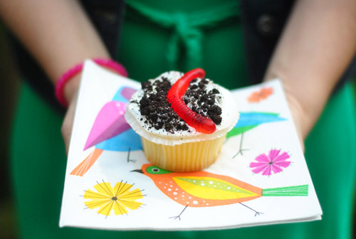 Também colocamos pequenos copos com minhocas de goma. Pendurar algumas sobre a borda como se estivessem rastejando para fora era a minha ideia de diversão. Ah, sim, eu moro no limite.